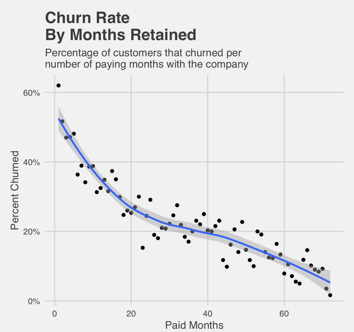 Customer churn is greatest among customers within the first 20 months of purchasing