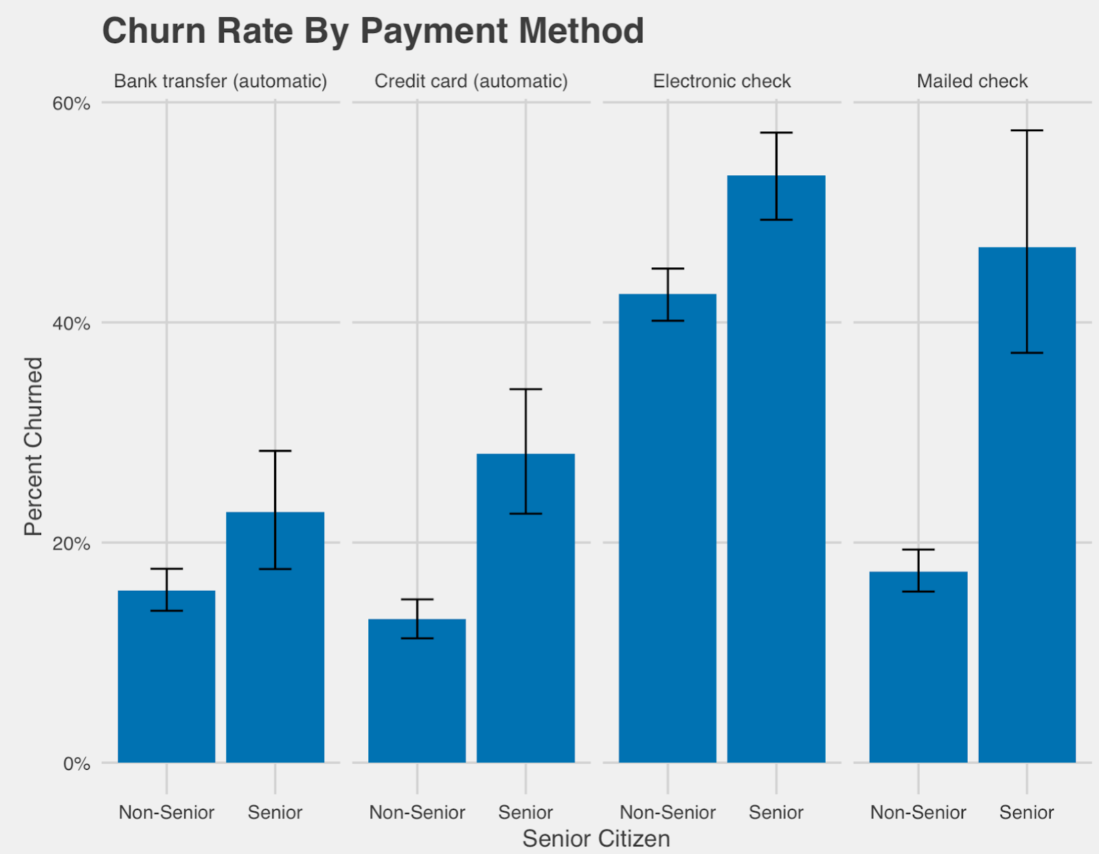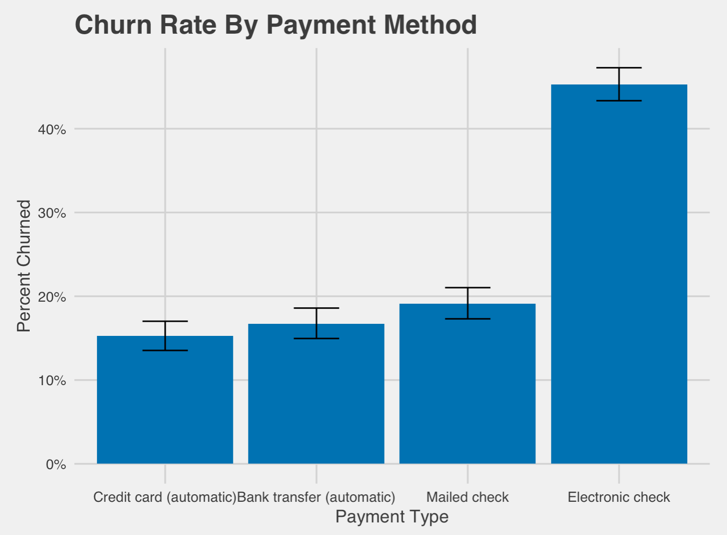 Customers paying by electronic check are more than 2X as likely to churn as other payment types.