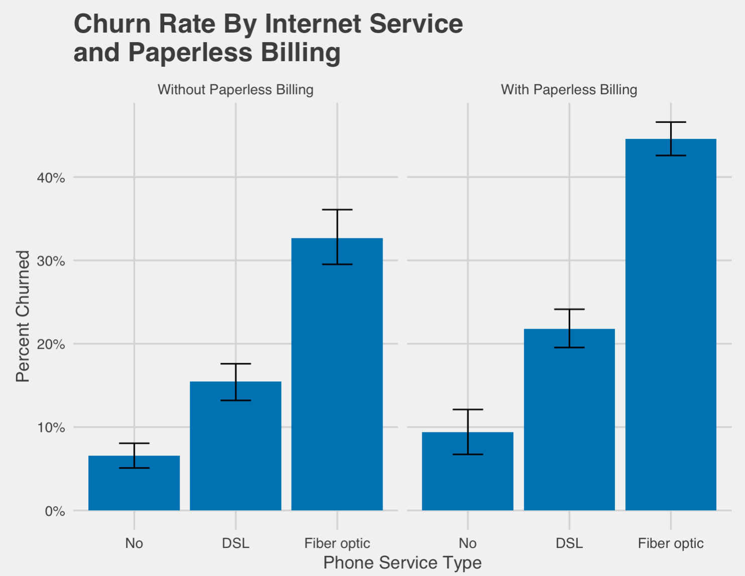 Paperless Billing appears to be associated with higher churn agnostic of product type.