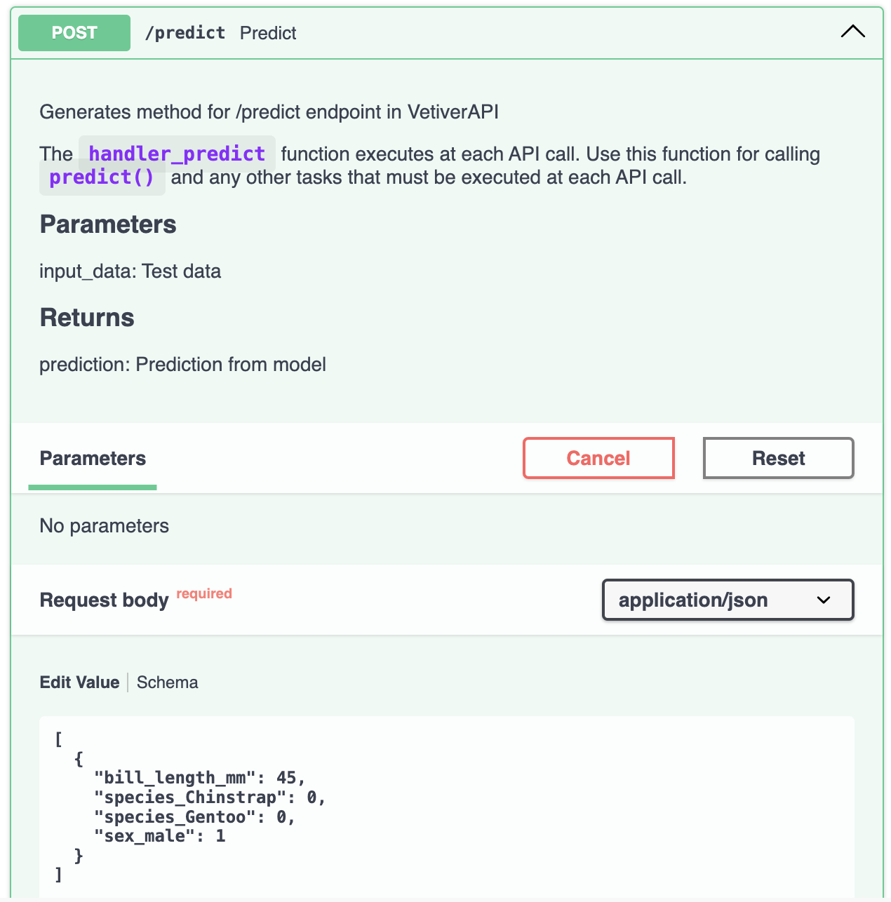 If we return to the FastAPI UI, we can click on POST / predict, Try it out, then change the JSON values to match our parameters in the app, and click Execute: