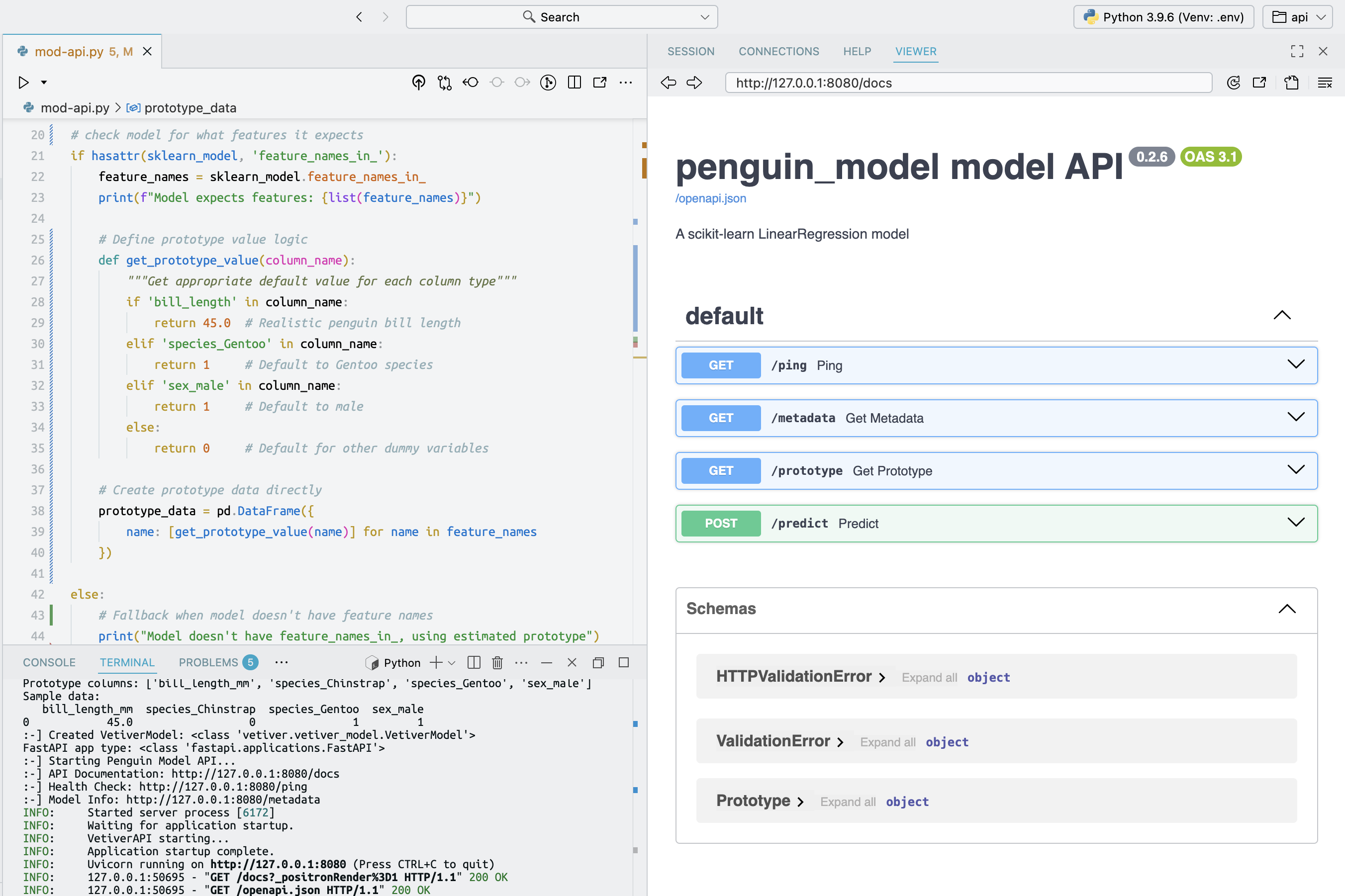 The Python script _labs/lab3/Python/api/mod-api.py will run the code for our Vetiver/FastAPI in a dedicated Positron/Terminal session. I’ve made a few changes to this version, but it creates an API with the same endpoints: