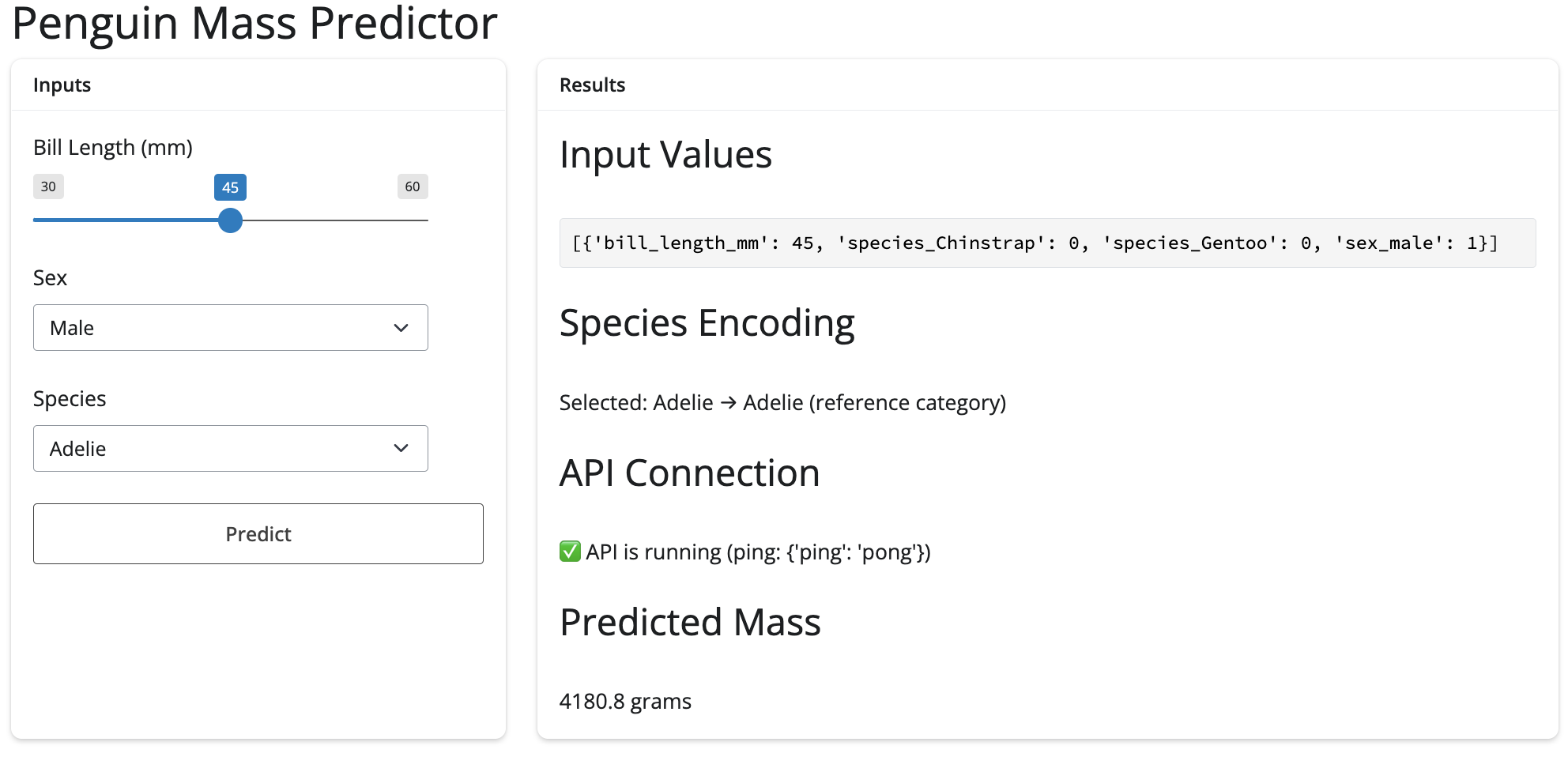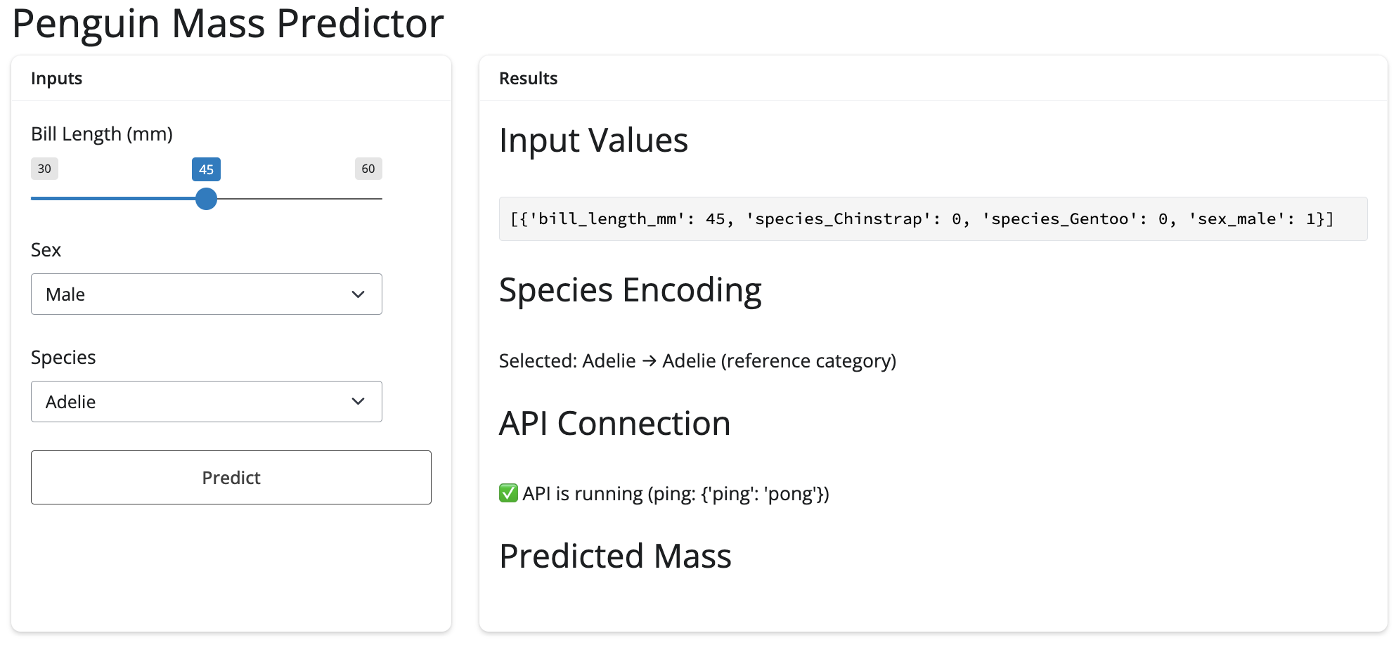 Shiny->>API: POST /predict<br/>{"bill_length_mm": 45.0,<br/>"species_Gentoo": 1,<br/>"sex_male": 1}