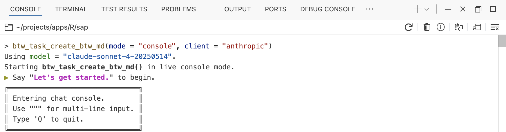We can use btw to work interactively in the Positron (or RStudio ) console by creating a btw-enhanced chat client and passing messages directly.6
