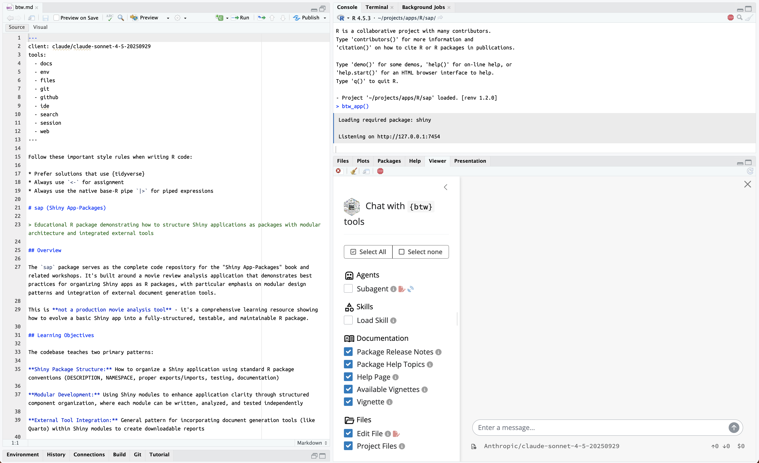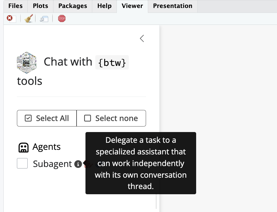 btw_app(), make sure you have the latest version ofshinychat.↩︎Subagent uses SOURCE, Load skill uses SOURCE, Package Tools uses SOURCE↩︎