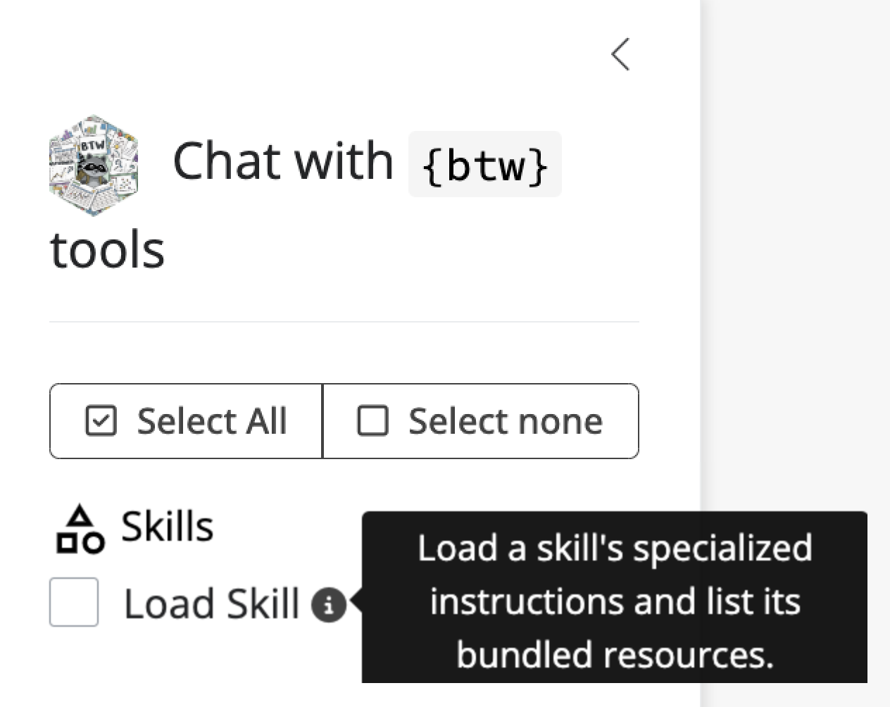 btw_app()If we expand the sidebar, we can see the registered tools provided by btw: