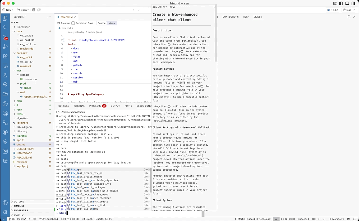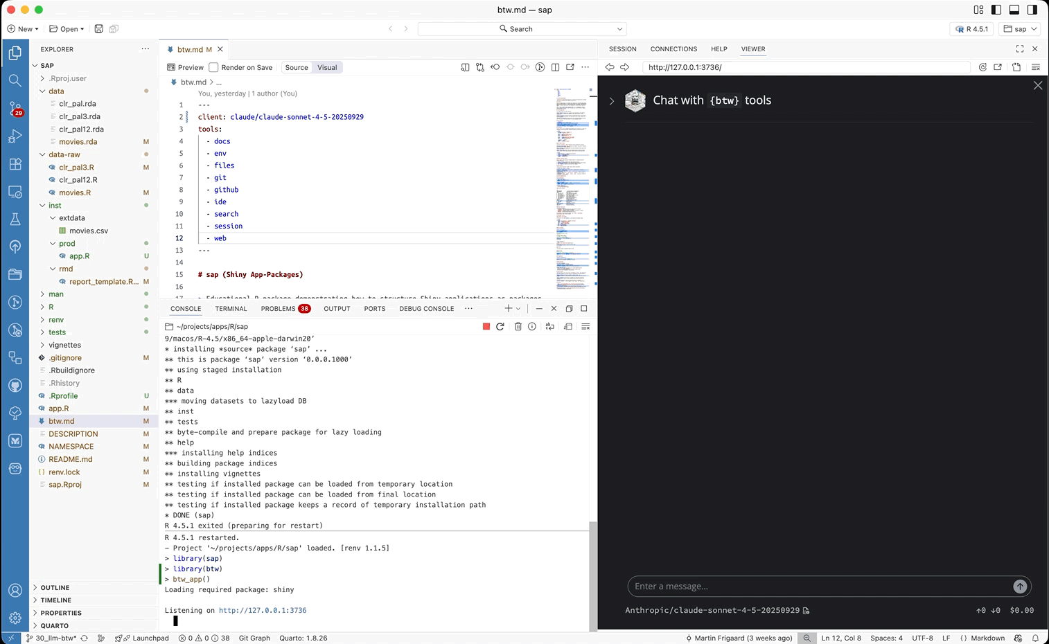 When Phase 2 is complete, we’re told we have a “comprehensive btw.md file that captures the essential information about [our] Shiny App-Packages project.” The full conversation with the model is stored in inst/prompts/btw-md-conversation.md.