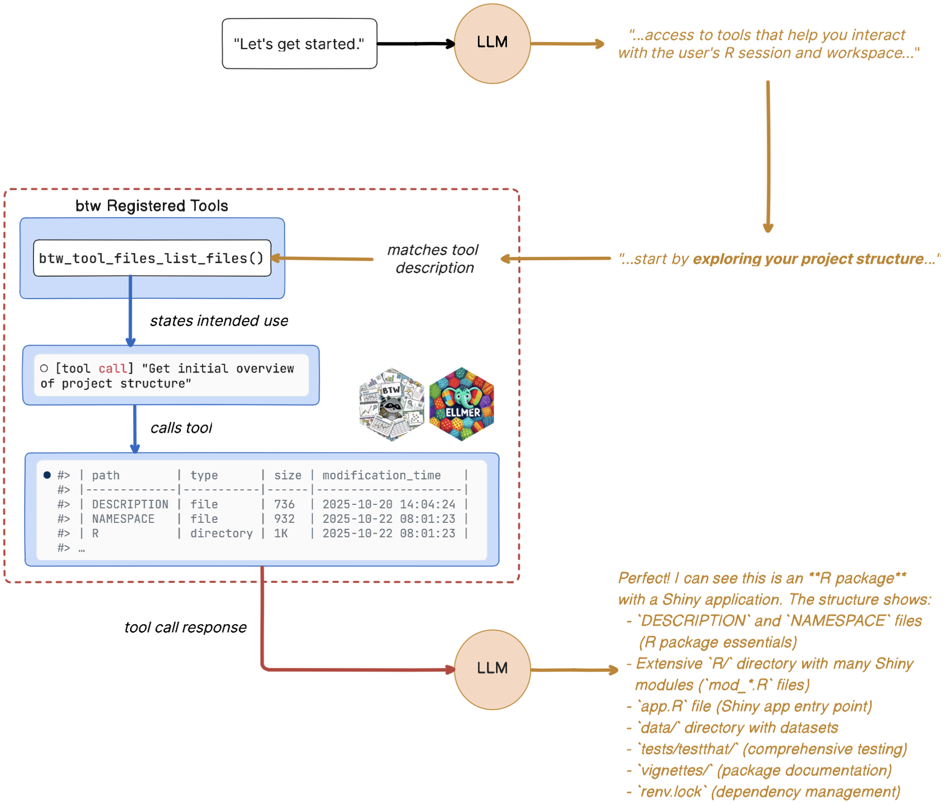 The output from chat$get_tools() is rather lengthy, but we can use Ctrl/Cmd + F to locate btw_tool_files_list_files(), which is the first tool called by the LLM.